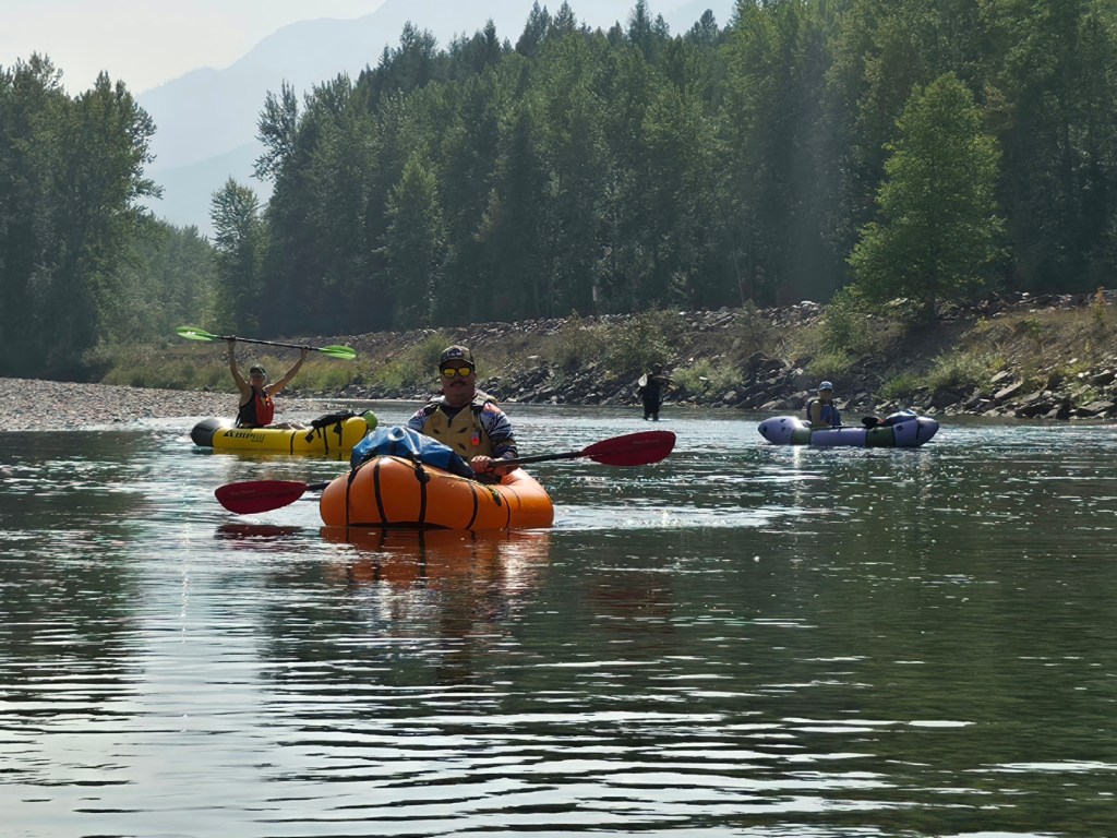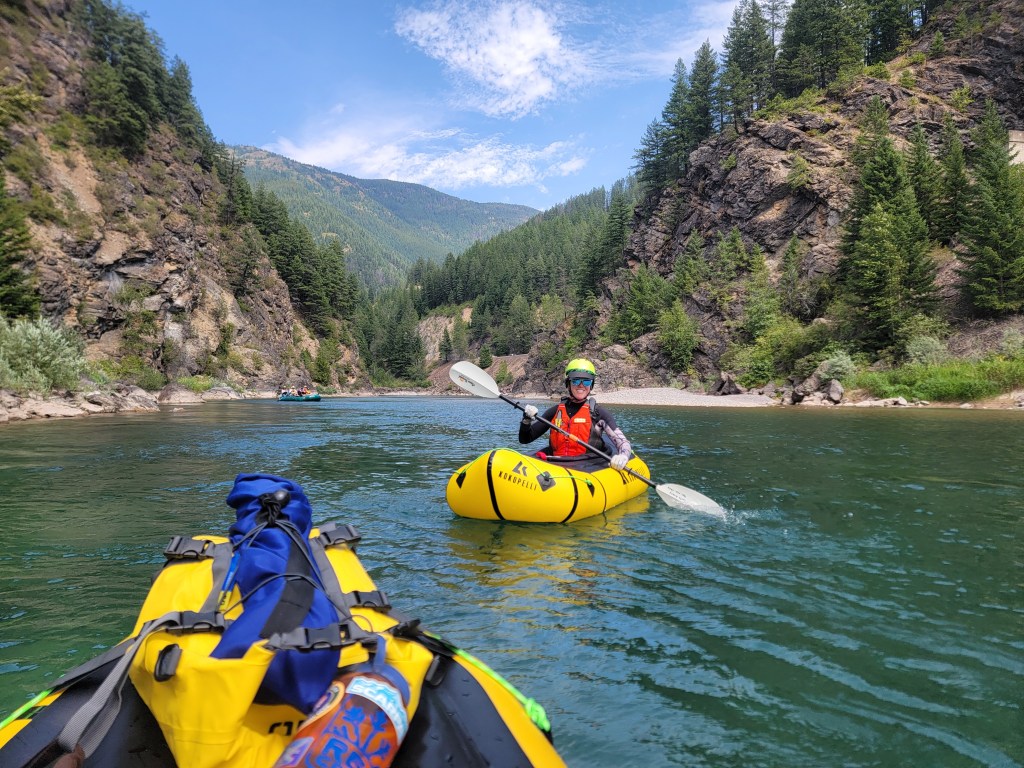 The hike in was just under five miles and quite chill. The trail was under forest canopy most of the way so we stayed cool. There wasn’t much elevation gain either so we made good time. Arriving at our launching spot we took a break to have a snack and hydrate. Then we opened our packs and began to set up for the float.